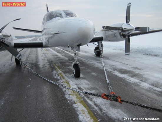 Heute kam eine zweimotorige Maschine vom Typ Cessna 441, Reg.: OE-FAN, bei der Landung am Flugplatz Wiener Neustadt Ost von der Landebahn ab und prallte gegen eine Schneewehe.