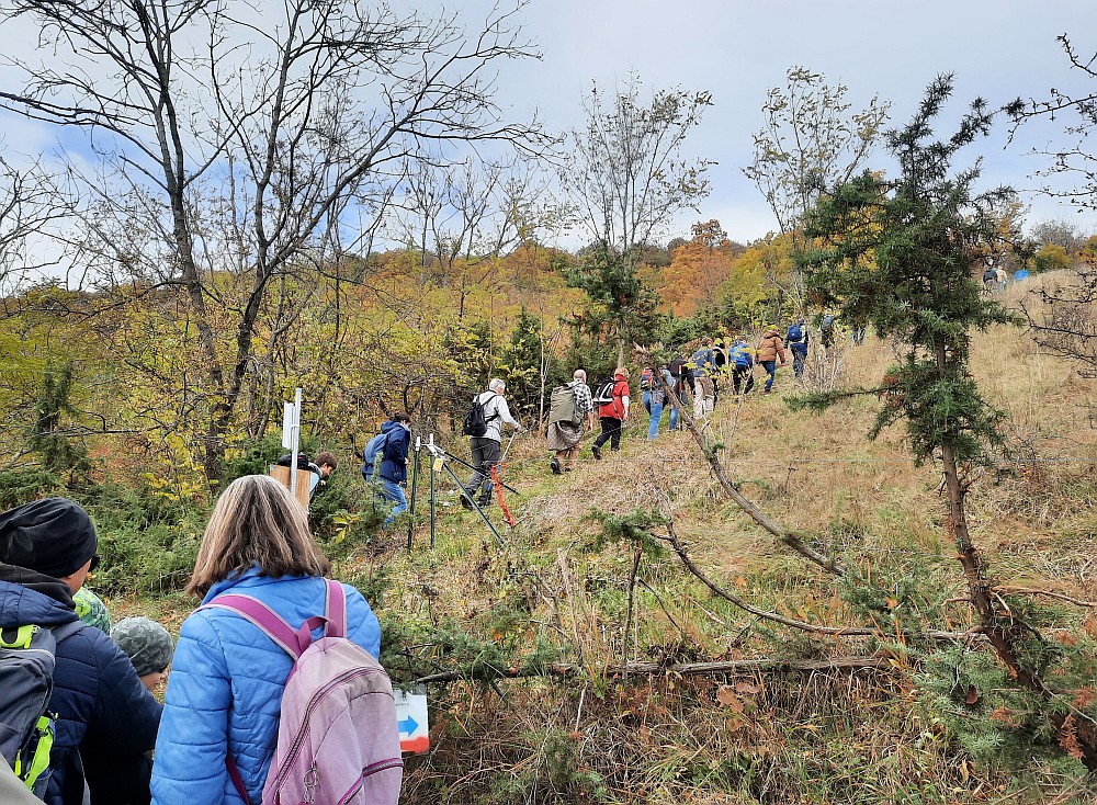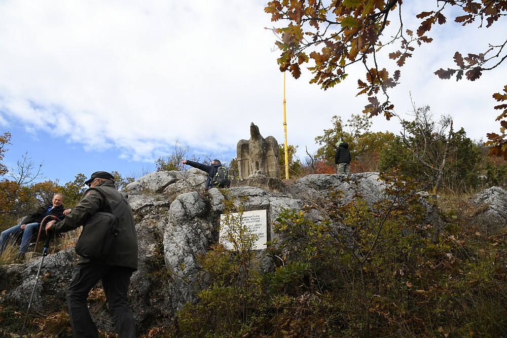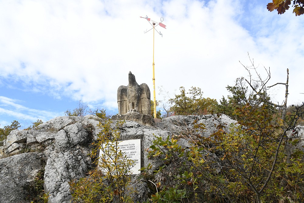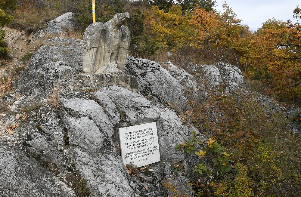 Schon gegen 9 Uhr trafen sich die ersten Teilnehmer im Restaurant Icarus am Flugplatz, um sich bei Kaffee und Kuchen zu laben.Dann wurde der "Befehl" zum Abmarsch erteilt. "Zirkusdirektor" Rudi Wenighofer, Obmann des Flugsporzentrums Spitzerberg, war an der Spitze. In etwa 45 Minuten marschierte dieser erste Pulk vom Flugplatz nach Hundsheim. Dort hatten sich bereits weitere Teilnehmer eingefunden, insgesamt etwa 50 Wanderer. Danach ging es als Gruppe über teils felsiges und anspruchsvolles Gelände hinauf zum Gipfel. Der Weg führte vorbei am steinernen Adler, der an die Flugpioniere der 1920er Jahre erinnert (und rein gar nichts mit der schrecklichen Nazi-Zeit zu hat).