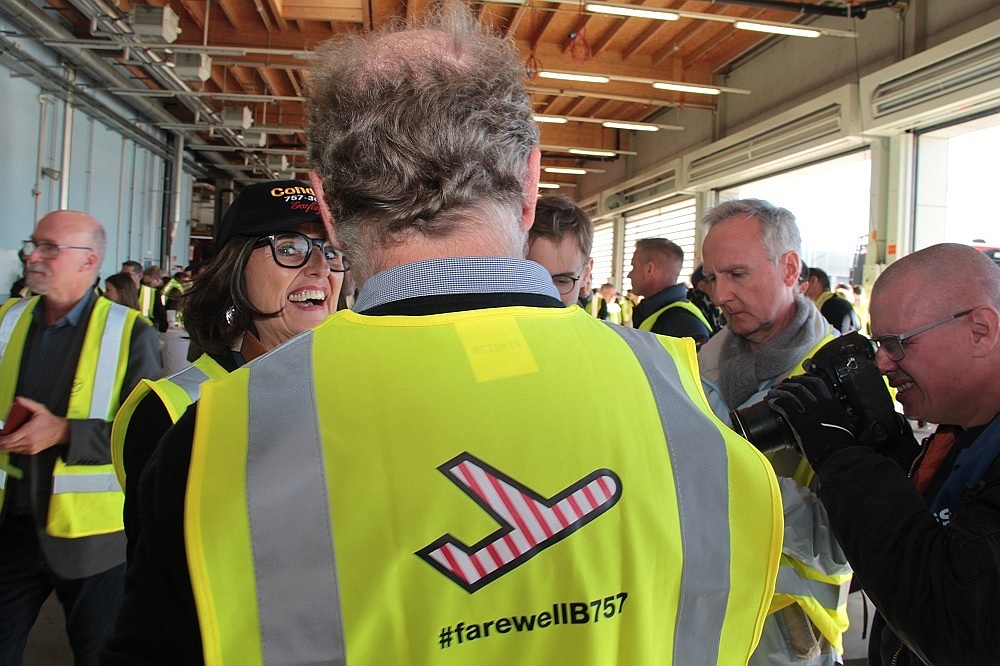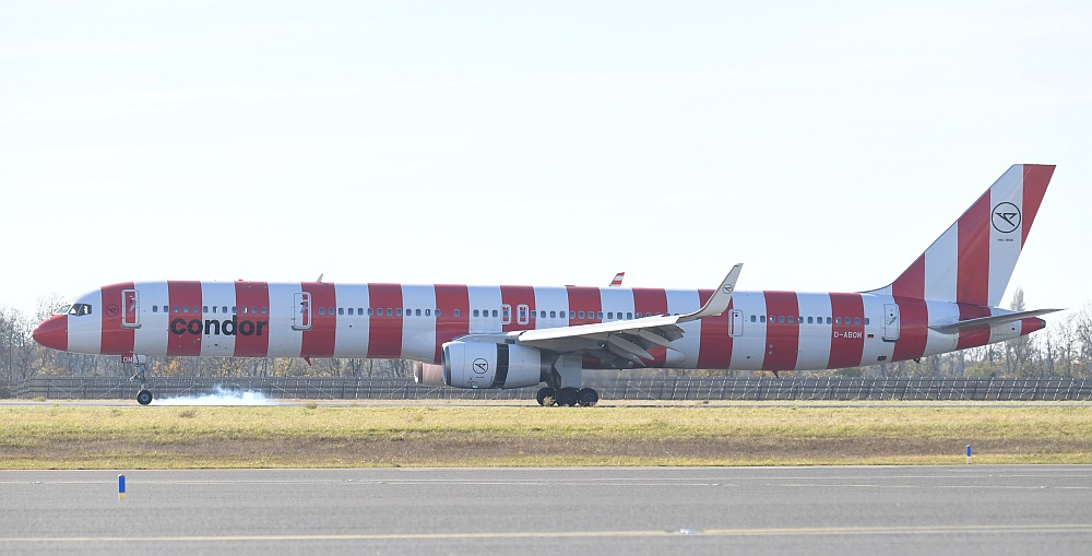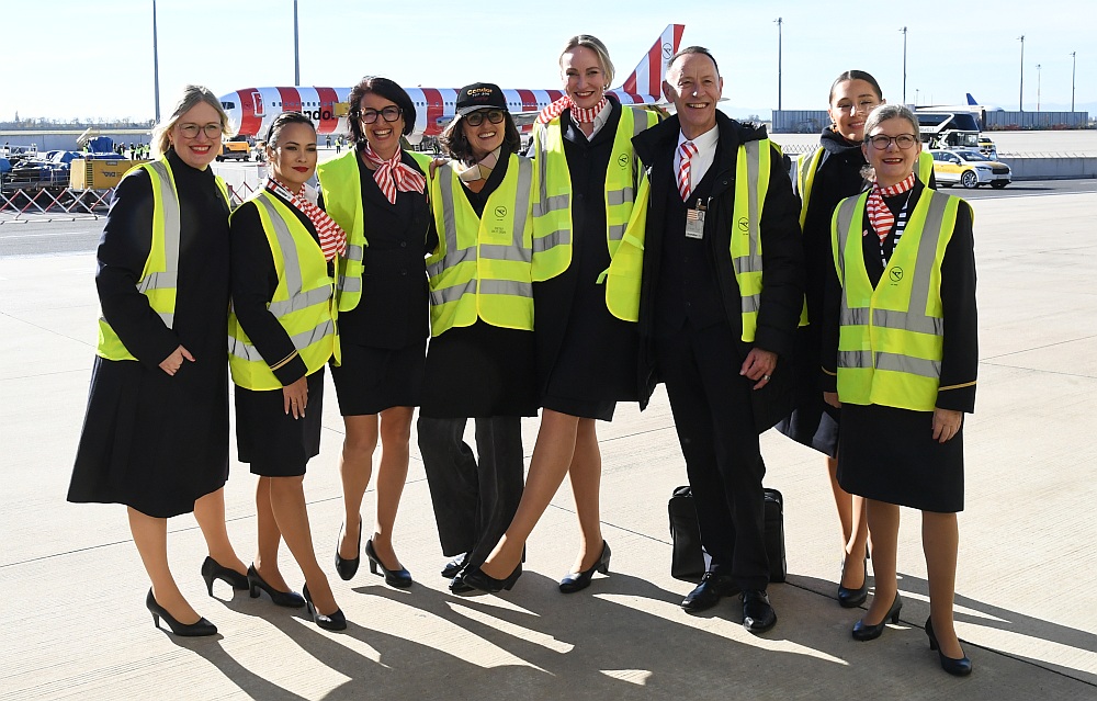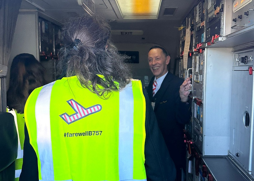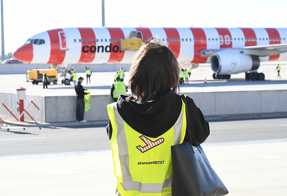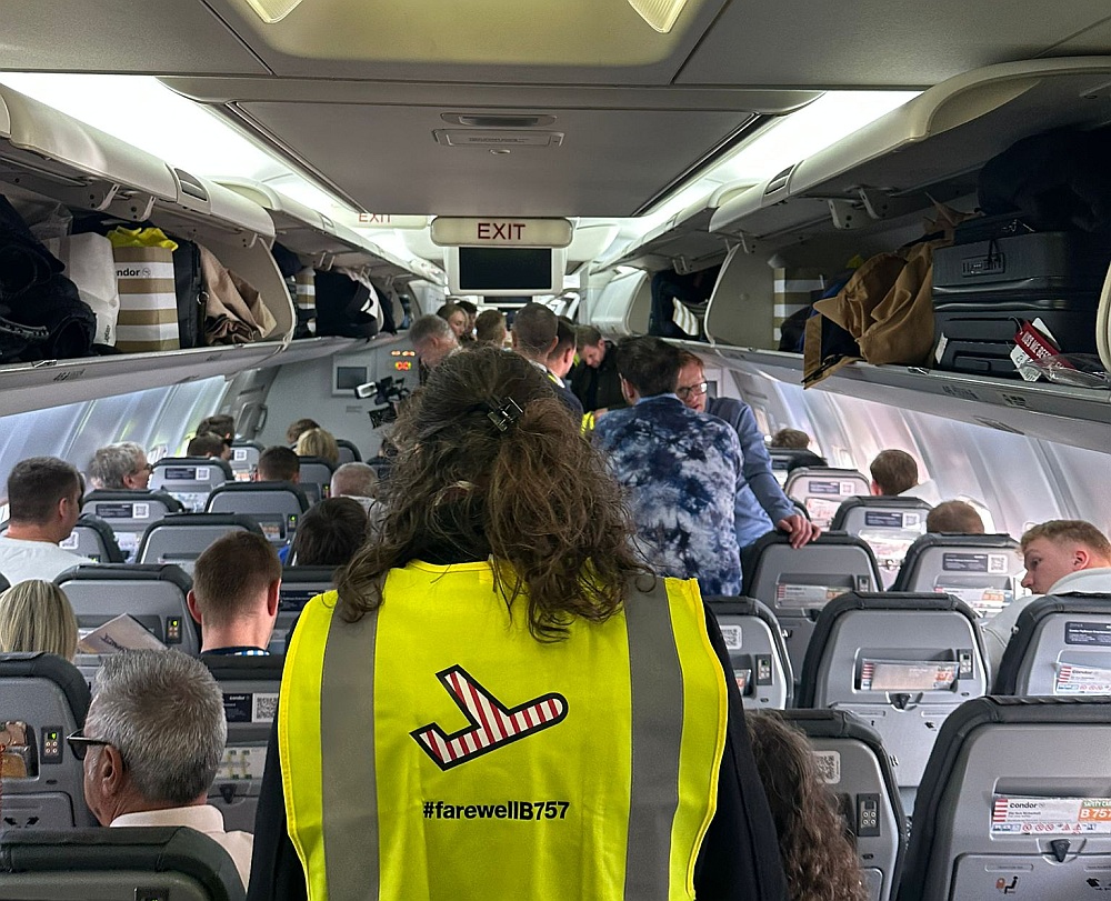 Auch für die Crew trotz aller beruflichen Professionalität ein emotionaler Moment. Im Cockpit saßen David Friedmann, Thomas Gall und Sascha Flamm. Die Kabinencrew stand unter der Leitung von Cornelia Schmiedel und bestand aus Mechthild Heeg, Rainer Becker, Pamela Hamburger, Katharina Franken, Martina Pöhland und Roxana Donna Yessica Beyreuther. Die Passagiere trugen gelbe Signalwesten mit "#farewellB757"-Aufdruck. Neben geladenen Gästen waren auch Condor-Mitarbeiter, welche die Tickets bei einer internen Verlosung gewonnen hatten, und zahlende Luftfahrt-Enthusiasten an Bord - darunter viele Frauen und sogar Familien mit Kindern. Der "Virus" Luftfahrt "infiziert" erfreulicherweise auch immer mehr Frauen. Zum Einsatz kam die Boeing 757-300 mit der Kennung D-ABOM. Sie wurde im Mai 2000, also vor rund einem Vierteljahrhundert, an den deutschen Ferienflieger ausgeliefert.