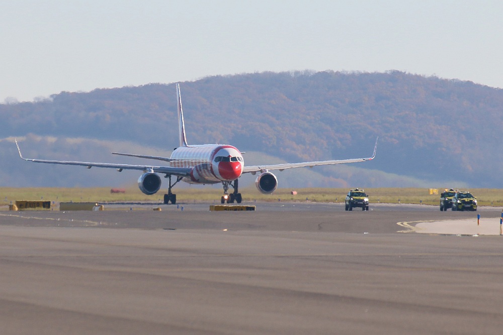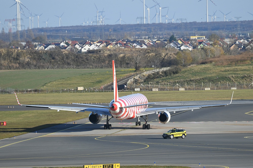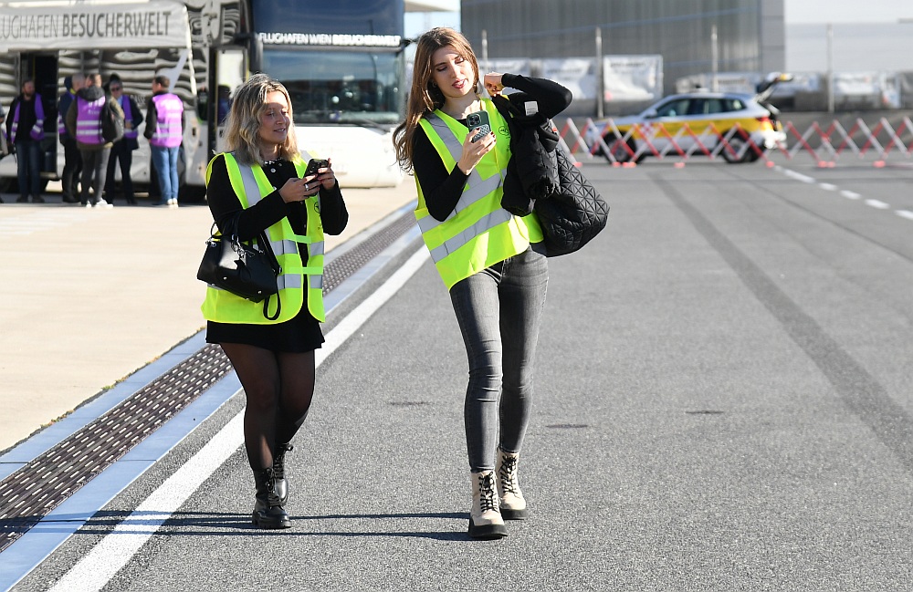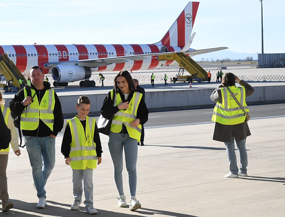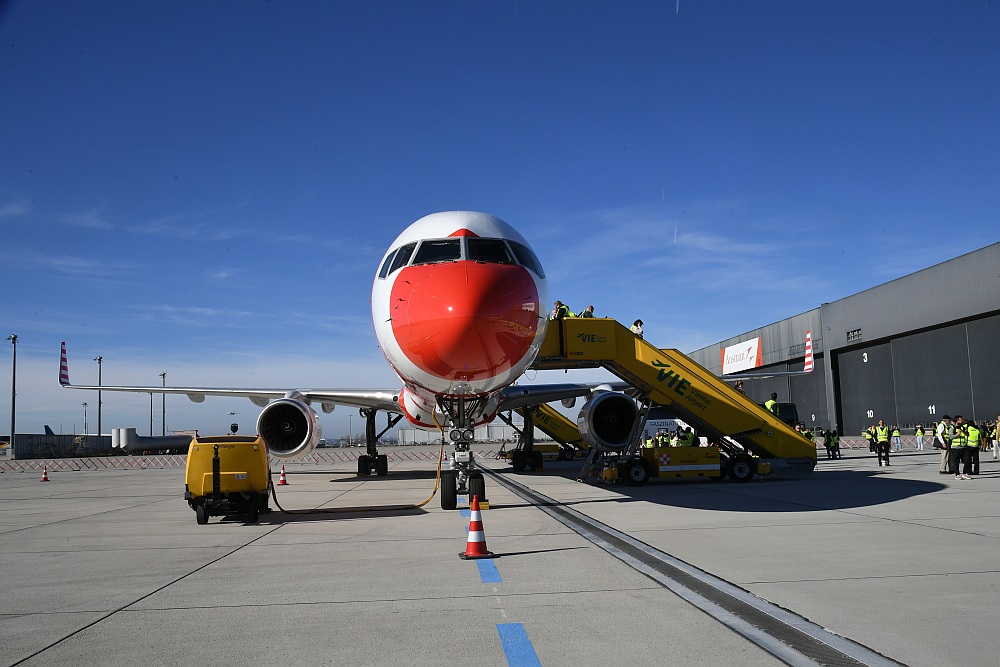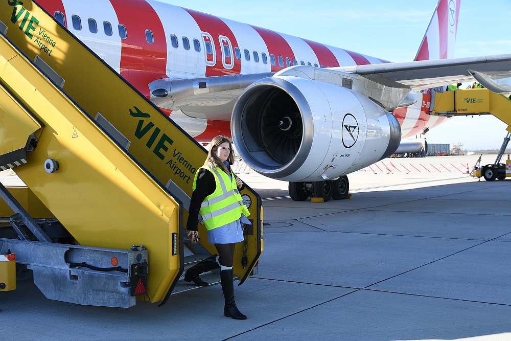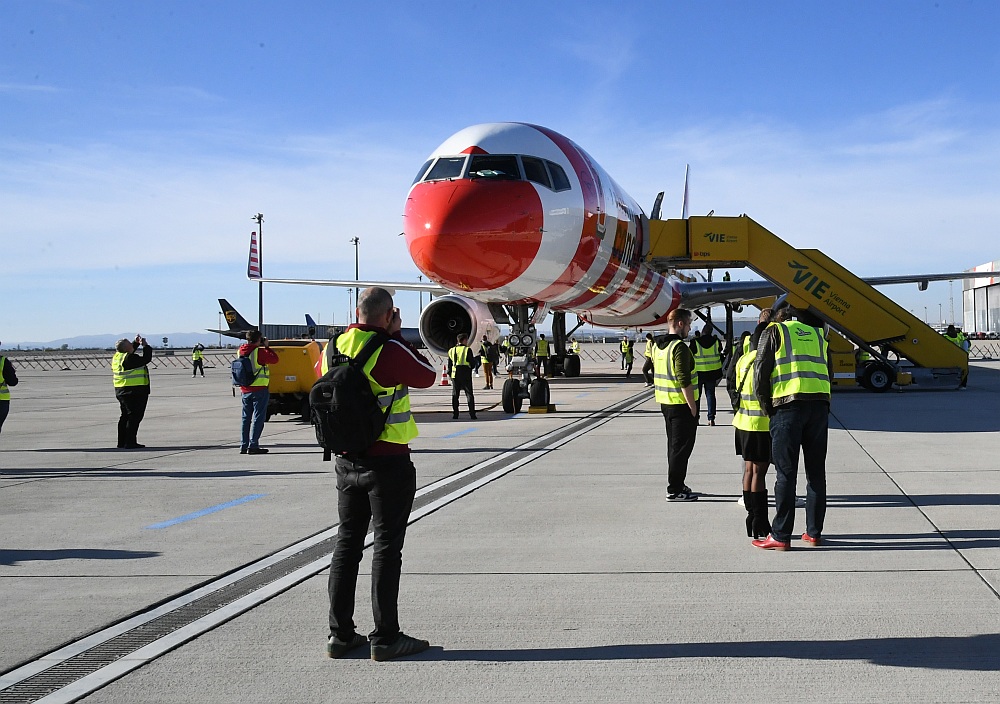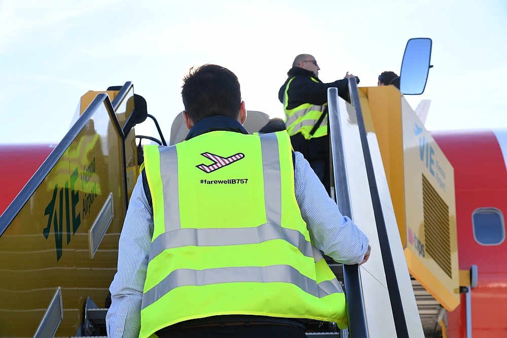Und dann schwebte die Boeing 757 majestätisch ein, setzte auf der Piste 11 auf und rollte - mit einer Ehreneskorte von drei Fahrzeugen des Bodendienstes - zu ihrer Parkposition auf dem Flughafen Wien. Die Flugnummer: DE 757 - stilvoller hätte man sie nicht wählen können.