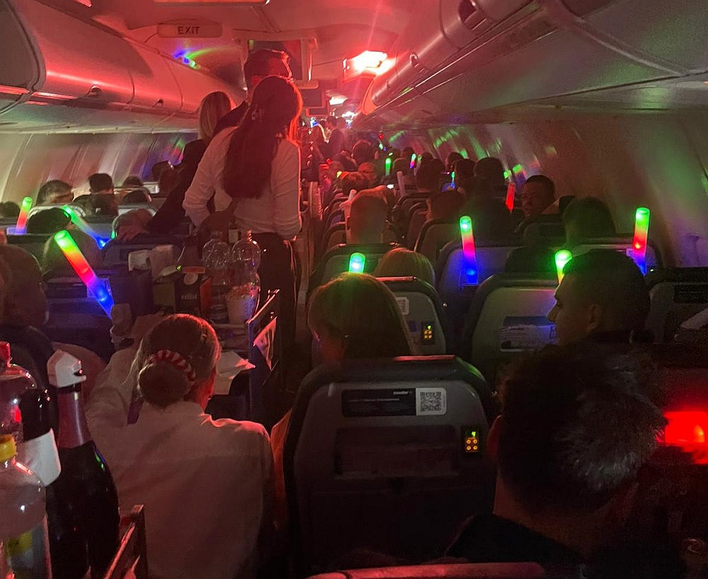 An Bord feierten Mitarbeiter, langjährige Wegbegleiter und Fans der Boeing 757 das Ende einer Ära und den Aufbruch in die Zukunft Condors mit einer von nun an reinen Airbus-Flotte. Auch der Hit "Take me home country roads" von Country-Legende John Denver (†), der selbst begeisterter Flieger war, durfte nicht fehlen.