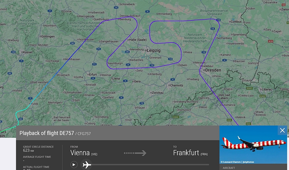 Beim Rückflug nach Frankfurt flogen die Piloten dann einige Schleifen, sodass auf dem Radarbild (zB bei Flightradar24) das Muster "757" erkennbar war.