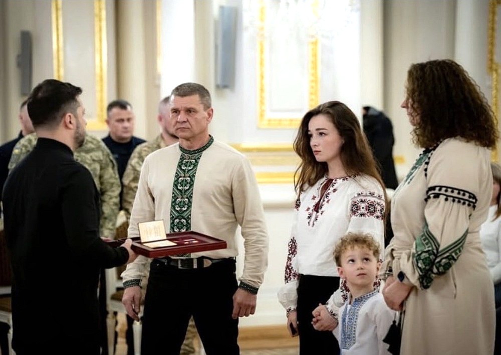 Der ukrainische Präsident Wolodymyr Selenskyj persönlich nahm die posthume Verleihung vor. Der Orden wurde an die Familie des gefallenen Helden übergeben - Ustimenkos Frau, seinen Vater und seinen kleinen Sohn übergeben. Die Familie von Oberstleutnant Maxim Ustimenko trug dabei traditionelle ukrainische Gewänder.