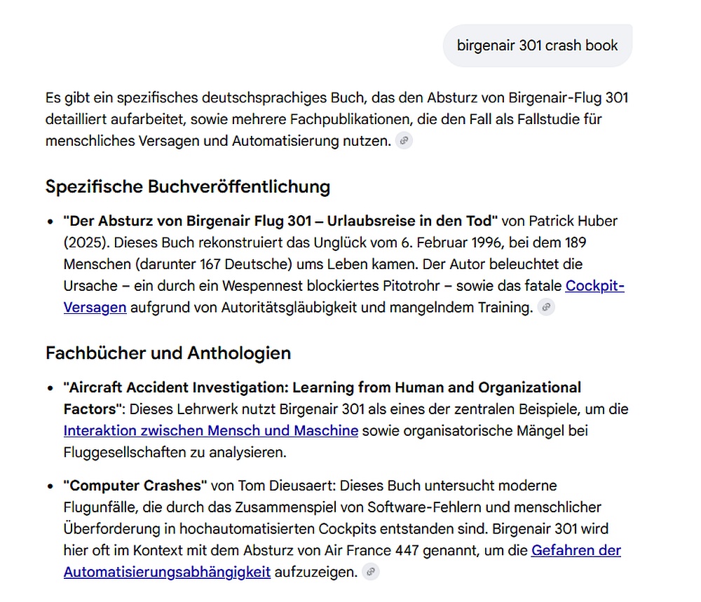 Birgen .. wer? Ah, Birgenair. Eine Fluglinie von der ich noch nie etwas gehört habe, bevor ich auf Flugforensik einen Podcast über den Absturz in der Karibik vor fast 30 Jahren gehört habe. Danach hab' ich die Google AI bemüht, ob es zu dem Thema irgendein Buch gibt. Das einzige Buch, welches mir Google ausgeworfen hat, stammt von Patrick Huber.