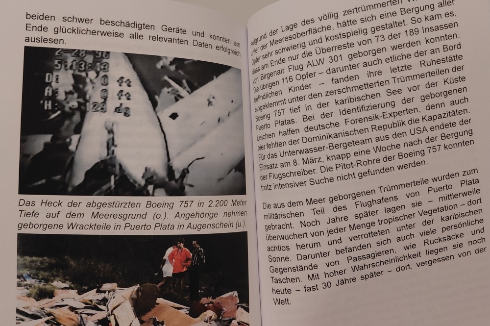 Mit 10 oder 11 Euro plus Porto ist es wirklich günstig und ich hab's mir über einen österreichischen Onlinehändler bestellt. Lieferung kam prompt, Qualität in Ordnung. Ein Softcover-Taschenbuch halt. Es hat ein bisschen weniger als 100 Seiten, ist gut strukturiert und verfügt über etliche Fotos, die ich zum ersten Mal gesehen habe. Der Autor hat laut den Angaben im Vorwort bei diesem Buch mit der Psychologin Sybille Jatzko zusammengearbeitet, von der er Informationen und Fotos bekommen hat. Frau Jatzko ist die Gründerin der Stiftung Katastrophennachsorge und kümmert sich mit ihrem Mann und anderen Helfern bis heute um die Angehörigen der Absturzopfer von Birgenair. Von 189 Toten waren über 160 Deutsche.