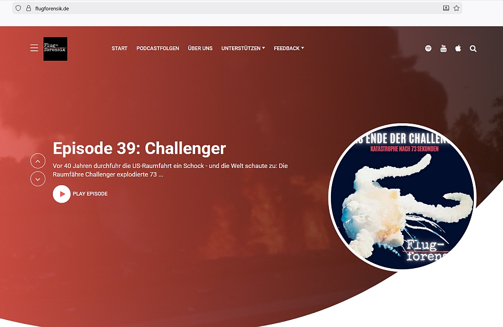Der aktuelle Podcast von Spaeth und Denes befasst sich mit dem Absturz der US-Raumfähre Challenger kurz nach dem Start. Millionen Menschen wurden damals vor den Fernsehbildschirmen Zeuge als die Challenger explodierte und ihre Crew ums Leben kam.