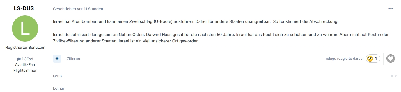 Eigentlich gilt das Schweizer "Flightforum.ch" als seriöses Portal. Eigentlich, doch in der aktuellen Situation durfte ein User dort eindeutig antisemitische Inhalte posten. Demnach sei Israel quasi selbst Schuld daran, wenn es gehasst werde und solle doch gefälligst auf den atomaren Erstschlag des Iran warten, um dann den Zweitschlag durchzuführen. Außerdem sei Israel für die Destabilisierung des Nahen Ostens verantwortlich. Es ist eine typisch antisemitische Täter-Opfer-Umkehr.