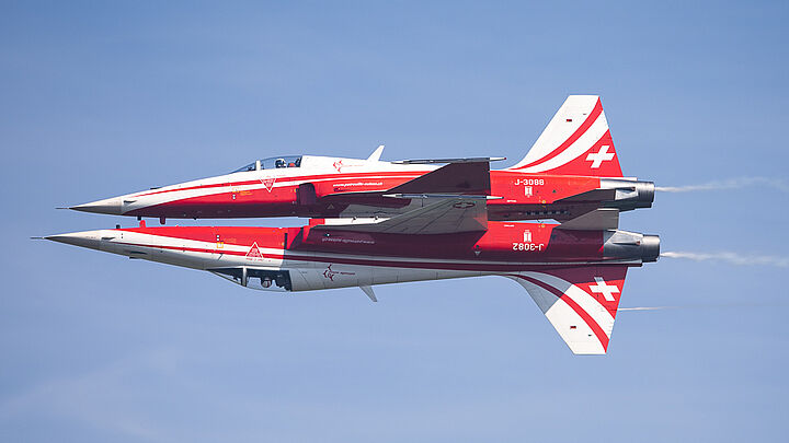 Zwei F-5 Tiger der Kunstflugstaffel aus der Schweiz stießen am Donnerstag in der Luft zusammen. Beide Jets konnten sicher landen. Eine Untersuchung…